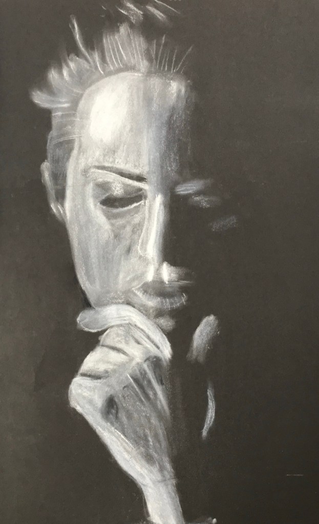 Alien Businessman – Pen and Ink drawing on paper – © 2024 Classmate Caricature – Marker on cartridge paper – © 2024 Picasso-inspired self portrait – Charcoal on cartridge paper – © 2024 Portrait from a reference image – White Charcoal on Black Paper – © 2024 Self Caricature – Charcoal on cartridge paper – © 2024