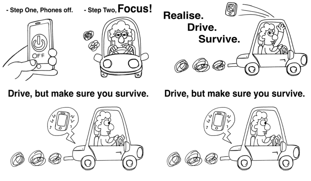 My first concept was a short animated campaign (REALISE. DRIVE. SURVIVE), which was enjoyed by the panel who were able to see it. However, on the day some of them had trouble seeing it due to technical issues. The technical issues I had with displaying the first concept, I believe was what led most of the panel to choose the second concept (Step One: Phones Off. Step Two: FOCUS!! Some of the feedback I recieved from the stakeholders on the day included: Changing the facial expression of the character (he looked kinda high here to be fair) and change the settings to appear more suburban rather than metropolitan. Here below, you can see the comparison between my original second concept and the final one. Similar in style but different in design.